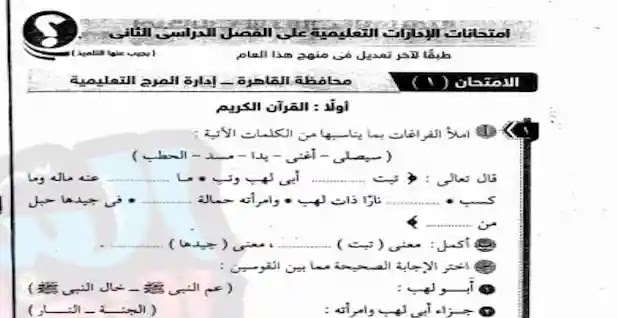 امتحان دين للصف الثاني الابتدائي الترم الثاني 2019