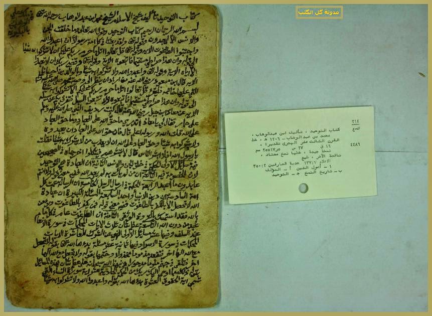 مخطوط كتاب التوحيد تأليف الإمام المجدد محمد بن عبد الوهاب رحمه الله نسخة جيدة خطها نسخ معتاد ناقصة الأخر خط في القرن 13 هج تقديرا رقم عام 4486 جامعة الملك سعود كل الكتب